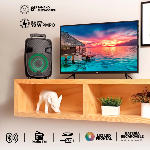 Parlante Con Batería Recargable con Potencia 8 W RMS y 70 W PMPO / Sub Woofer 8” X 1 Unidades , USB , Micro SD y Radio FM , Luz LED manija . Medidas (Alto x Ancho x fondo: 24,4 x 36,6 x 18,2 cm)
